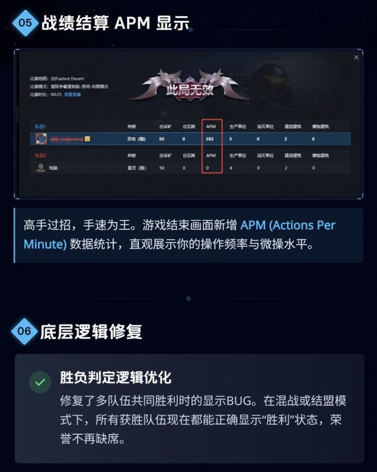 在對(duì)局結(jié)算與底層邏輯上,戰(zhàn)績結(jié)算頁面新增APM(Actions Per Minute)數(shù)據(jù)統(tǒng)計(jì),直觀展現(xiàn)操作頻率與微操水平,高手過招實(shí)力比拼更具參考性;勝負(fù)判定邏輯完成修復(fù)優(yōu)化,混戰(zhàn)或結(jié)盟模式下,所有獲勝隊(duì)伍均可正確顯示“勝利”狀態(tài),讓每一份榮耀都不缺席。