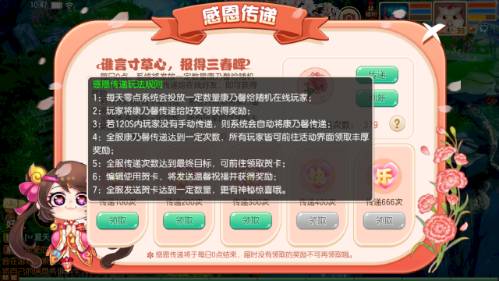 每天零點在線的玩家會隨機(jī)獲得康乃馨,將康乃馨在限定時間內(nèi)傳遞給好友便可獲得獎勵,如若超時將自動被傳遞出,全服傳遞的次數(shù)達(dá)到一定時便可領(lǐng)取相應(yīng)的獎勵,最終可獲得一張卡片,將卡片發(fā)送出去,達(dá)到一定數(shù)量時更有神秘驚喜哦!