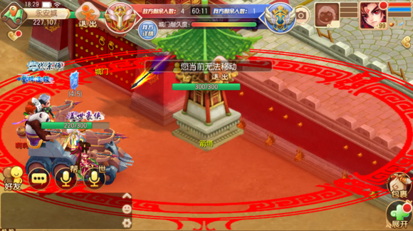 界面左上角有退出按鈕,界面上方顯示活動開啟倒計時、當(dāng)前場景內(nèi)人數(shù)、和“守方”提示字樣。同樣是在地圖中央有“準(zhǔn)備大廳傳送人”,可通過點擊NPC退出準(zhǔn)備大廳。準(zhǔn)備大廳內(nèi)的玩家和外面的小伙伴不能組隊;顒訙(zhǔn)備期間,每隔一段時間,幫派頻道還會有系統(tǒng)提示“本次攻城戰(zhàn)本幫為守方,請大家齊心協(xié)力,守衛(wèi)皇宮!”怎么樣,有沒有一種責(zé)任感油然而生呢?