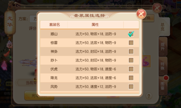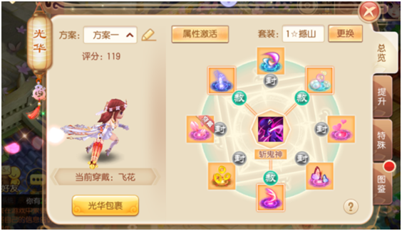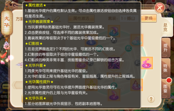 如果少俠將八種基礎(chǔ)光華均提升到1星以上便可激活套裝屬性,套裝屬性也是可以根據(jù)自己的職業(yè)和需求自由選擇效果的呢。ü馊A套裝的級別取決于八大基礎(chǔ)光華中最低的級別)