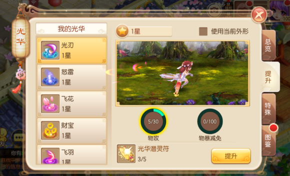少俠可以通過各種途徑收集光華道具。光華的升星可通過吞噬同一類型的光華進(jìn)行升星,并且光華的屬性可通過潛能符去進(jìn)行提高。