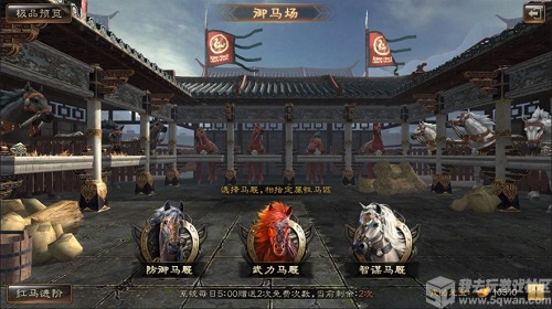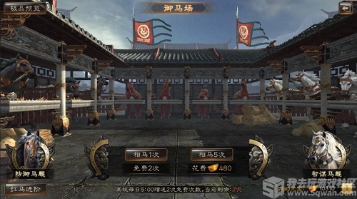 每天主公有2次免費(fèi)相馬的機(jī)會(huì),用完次數(shù)之后可用元寶繼續(xù)相馬。每次相馬消耗96元寶,可獲得隨機(jī)馬匹。相馬5連,可增加極品馬出現(xiàn)的幾率。每個(gè)馬廄中各有一種極品馬,武力的為赤兔,防御的為烏騅,而智謀的為的盧。主公得到極品馬可獲得最大加成。