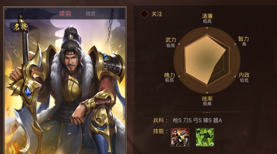 項(xiàng)羽是中國(guó)歷史上少有的年少成名并且戰(zhàn)功赫赫的少年英才,可惜在策略和遠(yuǎn)謀上面不夠出色,最終敗給了昔日亭長(zhǎng)劉邦,難免有些可惜,很多著名詩(shī)人也曾經(jīng)對(duì)項(xiàng)羽表示過(guò)敬佩,比如“生當(dāng)作人杰,死亦為鬼雄”,雖然在歷史長(zhǎng)河中,我們無(wú)法改變事實(shí),但假使在游戲中項(xiàng)羽成為了你的部下,你如何操縱才能打敗其他人一統(tǒng)天下呢?