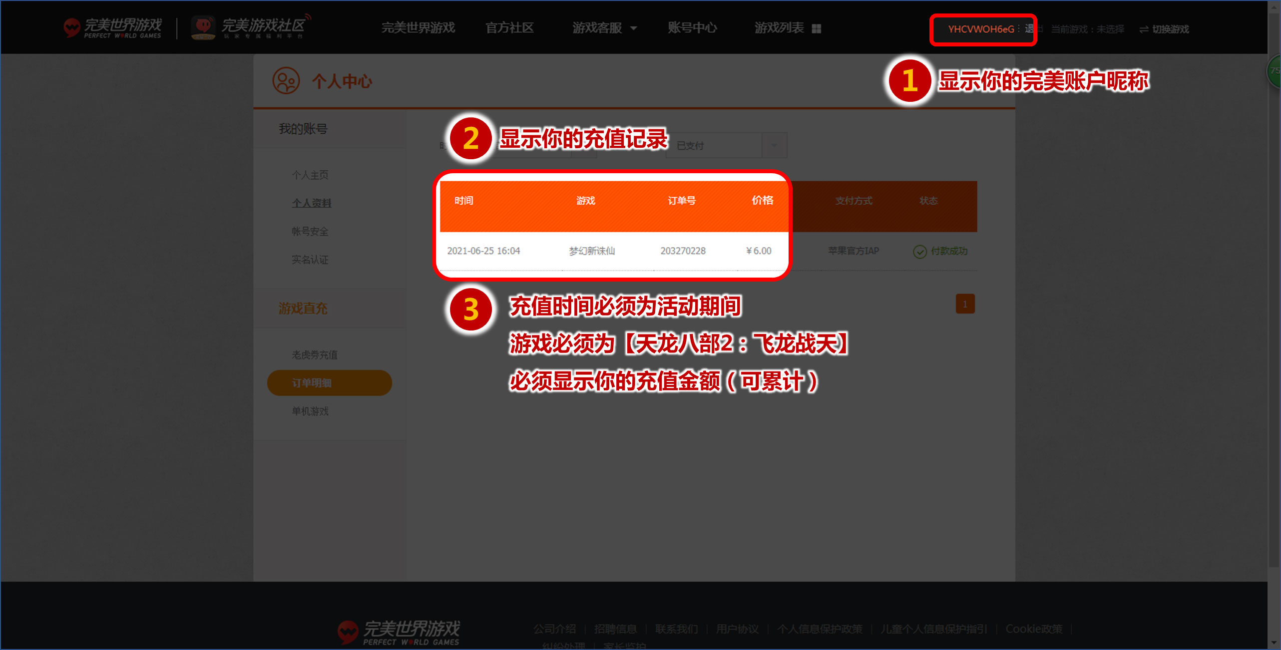 2、上傳截圖必須包含完美賬號個人中心訂單明細:時間、游戲、訂單號、價格等信息,如截圖示意;
