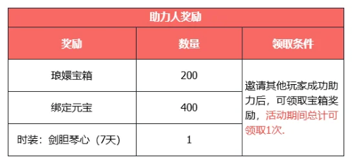 4、符合要求的玩家助力成功后,可領取助力獎勵,200個瑯嬛寶箱,400綁定元寶和時裝:劍膽琴心(7天),活動期間總計可領取1次。