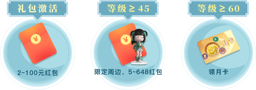2、活動期間玩家上傳新服角色等級截圖,角色等級達到45級,可隨機抽取限定周邊-盲盒與5~648元的紅包;角色等級達到60級可直接獲得月卡1張,活動獎品數量有限,先到先得;