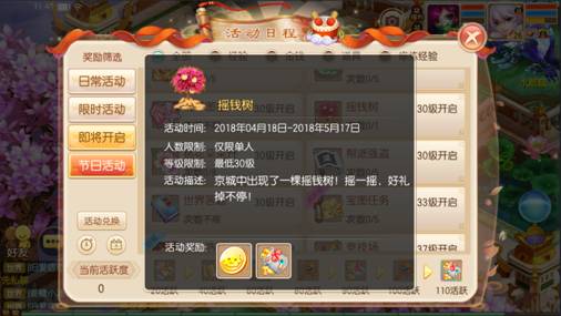活動期間每天可在京城的搖錢樹處搖一搖,從而獲取獎勵,每人每天僅可搖一次。