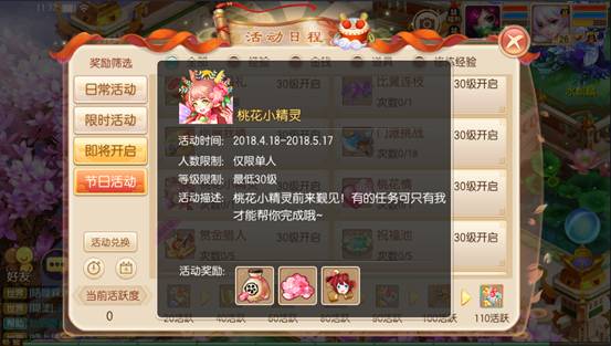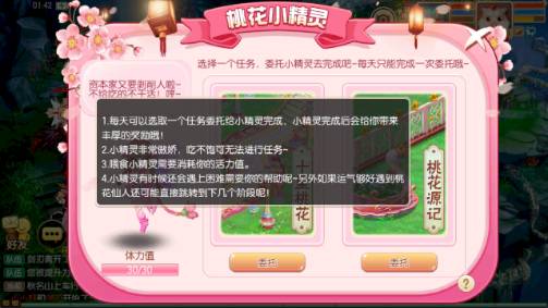 每天都可對小精靈進(jìn)行一項委托,但是小精靈要填飽肚子才會去執(zhí)行委托哦,而給小精靈投喂是會消耗一定的活力的。小精靈在執(zhí)行委托的過程中,遇到了麻煩是需要少俠們?nèi)椭黄鹜瓿傻,如果運氣好的話會遇到桃花仙人哦,巧遇桃花仙人是會有╰(*°▽°*)╯驚喜的呢!