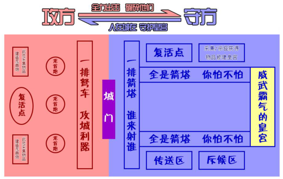 戰(zhàn)斗開始后,進(jìn)入到攻城戰(zhàn)活動地圖,該地圖的各個功能區(qū)布局如下所示: